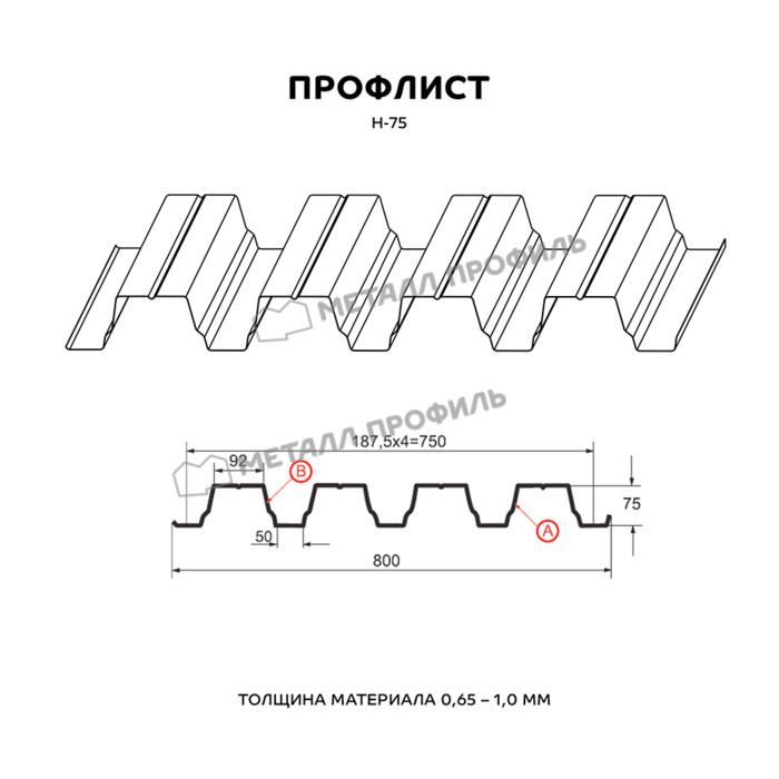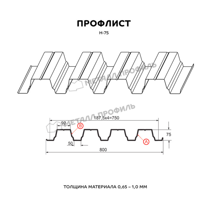 Предлагаем купить профилированный лист Н-75 в Балашихе. Он является оцинкованным стальным материалом, имеющим покрытие. Толщина стальной основы с защитным покрытием составляет 0.8 мм. После проката на специализированном оборудовании лист приобретает рисунок из повторяющихся волн, что значительно увеличивает его жесткость по сравнению с плоским материалом.